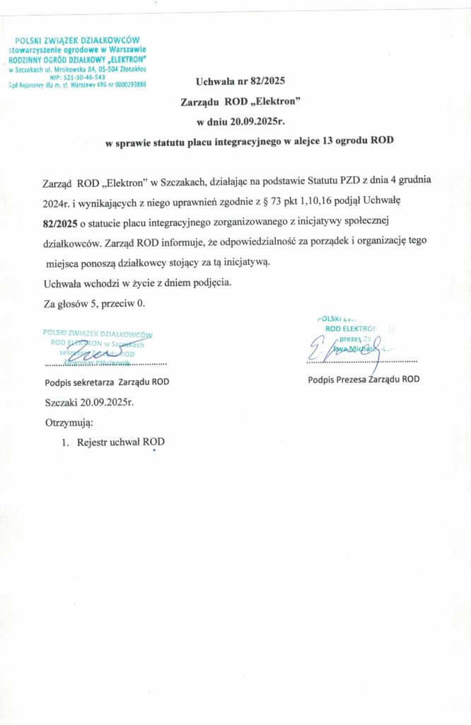 Drodzy działkowcy ROD Elektron przedstawiamy uchwałę w sprawie statutu placu integracyjnego w alejce 13 ogrodu ROD.